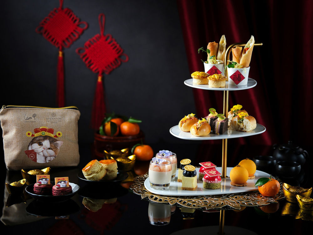 The Purrfect afternoon tea at the Sky Lounge, jointly curated by the hotel and LeonLollipop, features a spread of Hong Kong-style inspired savoury and sweet pastries. Guests enjoying the set can take home a complimentary cosmetic bag bearing a model of Gloomie the cat, a LeonLollipop character, in themed Chinese New Year dress.