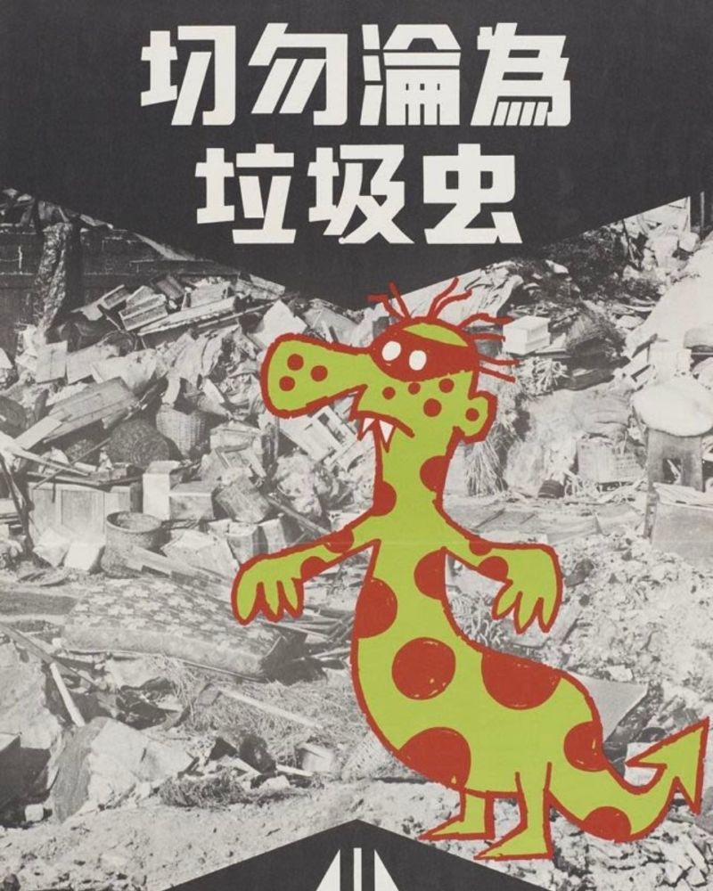 There was a great emphasis on the moral perils of being a litterer, with authorities even going so far as to name and shame convicted offenders in published newspaper ads to go along with the materials. One of the seminal pieces of media that Lap Sap Chung will forever be remembered by is a poster captioned “Don’t become a litterbug” (切勿淪為垃圾虫; chit3 mat6 leon4 wai4 laap6 saap3 cung4), which depicted the character in front of a rather bleak black-and-white photograph of a landfill.