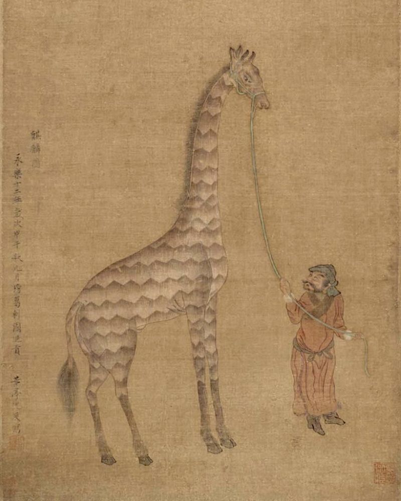 Other stories also tell of the qilin as more earthly creature. According to the History of Ming (明史), Bengala envoys gifted a “qilin” to Emperor Yongle in 1414. Zheng He, a Chinese admiral and diplomat, also brought home the same species from his travels to Somalia. Upon seeing these colossal, hoofed herbivores, the emperor was convinced that the tributes were physical manifestations of the mythical qilin, and he commissioned artworks to be painted of each living miracle, all titled The Eulogy of the Qilin, an Auspicious Omen. Little did he know, though, this “magical creature” is what is known as a giraffe today.