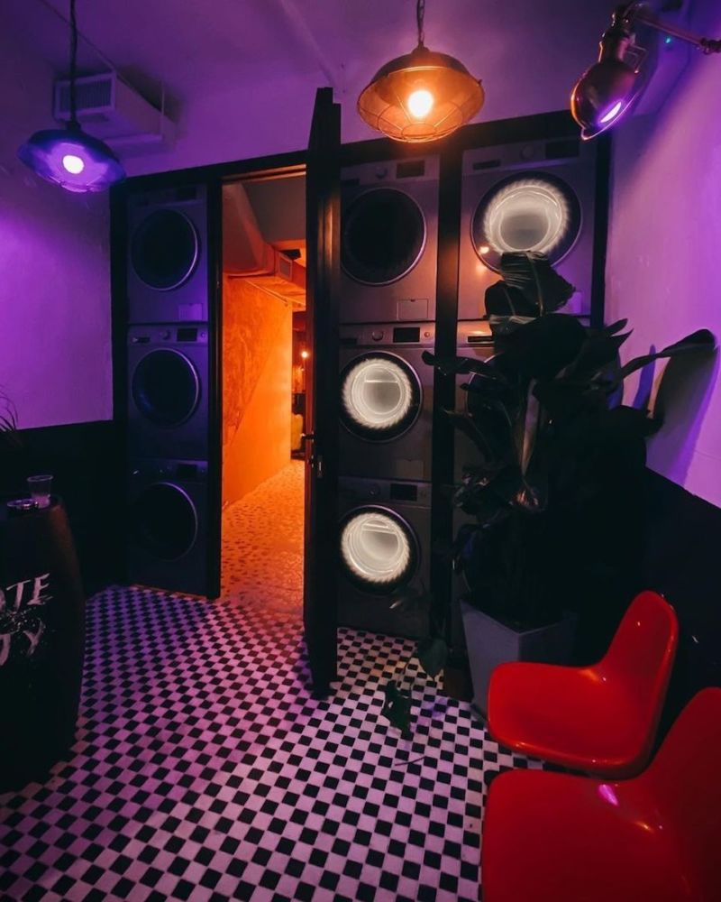 From the outside, Dirty Laundry appears for all intents and purposes to be a laundromat—a groovy one, at that, with purple lights and a retro checkerboard tile—but pull open the door on the second panel to the left and you’ll find a drinking den bathed in the warm glow of a huge chandelier and neon lights. With jumbo-sized shots (nicknamed “longs”), beer pong, beer towers, and a stage-grade smoke machine, Dirty Laundry is the kind of place to have fun—a lot of it.
