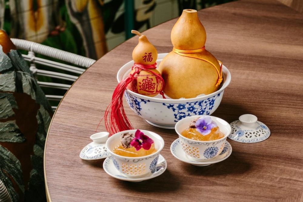 Start off with a delightfully crunchy sliced duck skin with Kaoliang liquor osmanthus pudding served atop a potato crisp, washed down with a tea-based sparkling cocktail. You’ll delight at the themed shot glasses that feature carved likenesses of the 12 Chinese zodiac animals, presented with a drunken whole abalone for a quirky touch mid-meal.