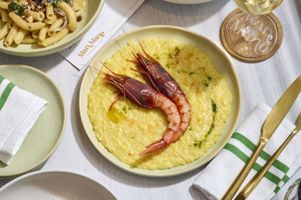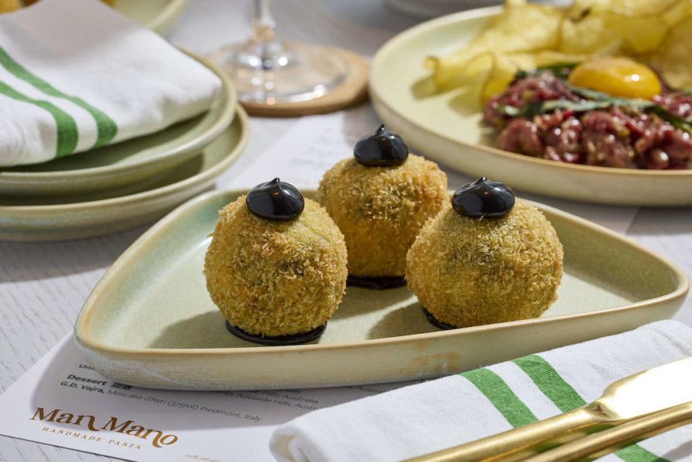 Order the arancini with mozzarella and squid ink for starters, followed by the semolina-based gnocchi Roma with sous-vide and pan-fried pork trotter, the saffron risotto with plump Italian red prawns, and the whimsical cannoncini with pistachio cream filling.