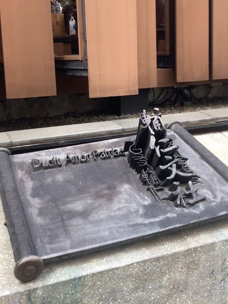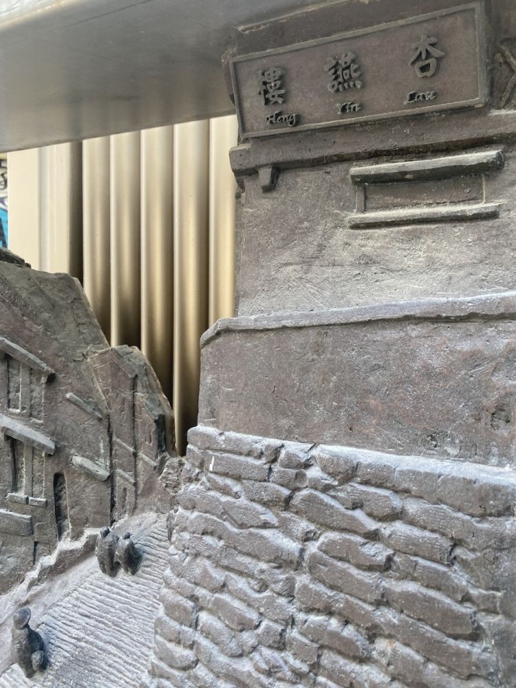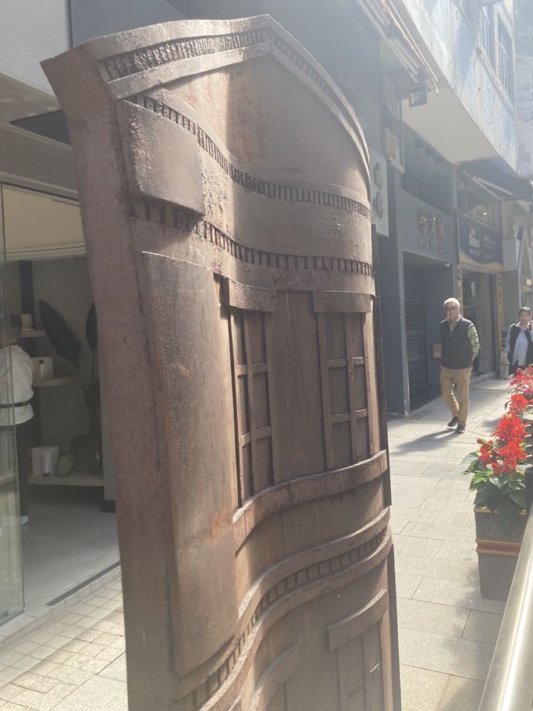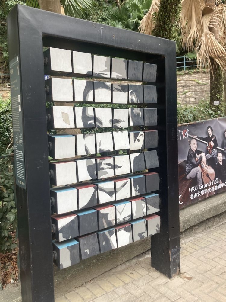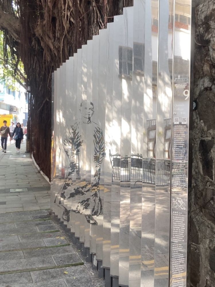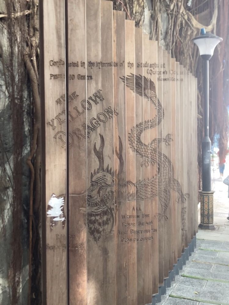 If you stay on the other side of the street, you can walk along Hollywood Road towards Sheung Wan and encounter the next art installation. It runs along the stone wall that marks PMQ, as an homage to Queen’s College. Before it was PMQ as we know it today, and even before it was inhabited by married police officers, this was the location of a historical building housing Queen’s College. The Government School where Sun studied was moved to this location after his time there, and it is said he attended its inauguration. With this in mind, architect Kenneth Tse created a double-sided artwork. From one side, the wooden poles are engraved with a dragon, a nod to the Yellow Dragon school magazine. Coming from the other way, the poles are mirrored and form a picture of Dr Sun Yat-sen.