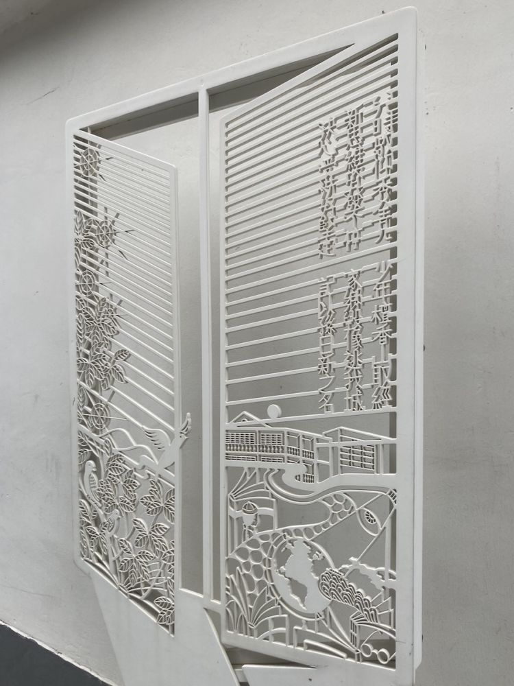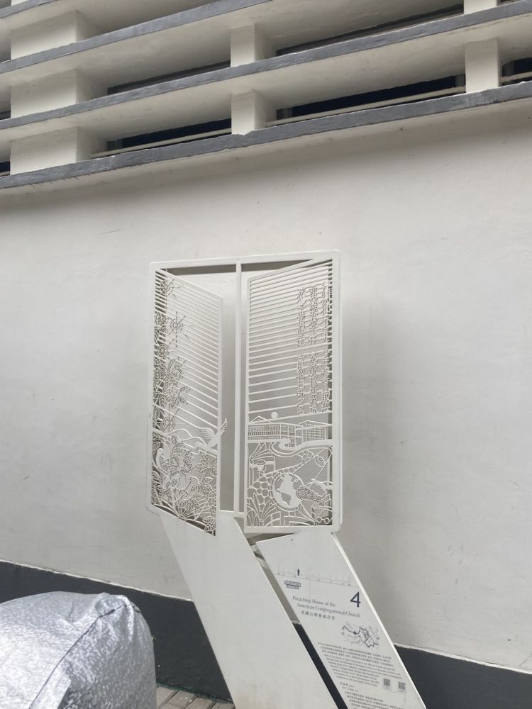 On the way out of Poho and into Sheung Wan, you’ll reach Bridges Street. Walk until you reach the current location of the Hong Kong News Expo, situated on your right. Along the white wall is a delicate installation also by Joey Lung, a white metallic sculpture resembling an open window. Adorned with birds, a planet, a pair of glasses, Chinese characters, and more references to his memories, it invites viewers to discover another chapter of Sun’s story. Although it looks different today, this location was the site of the Preaching House of the American Congregational Church, where Sun lived and was baptised.