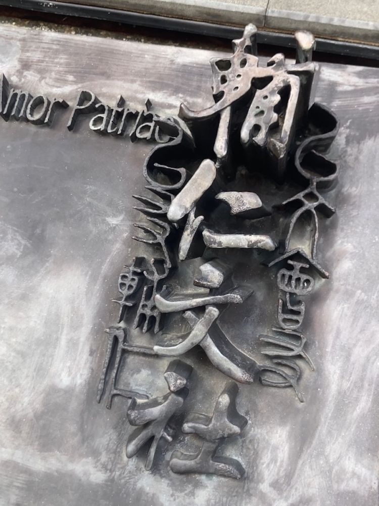 Following the steps down, you reach Pak Tsz Lane Park. The park hosts not one, but two landmarks of the Dr Sun Yat-sen Historical Trail. The first, located just behind the large wooden panel, is an homage to the Foo Yan Man Ser, or “Chinese Patriotic Mutual Improvement Association,” also known as the “Furen Literary Society.” Founded in 1892, the group was made up of young men who shared similar political ideals and hoped to enlighten the public. Sun was not a member, but he kept close ties with the group occupying the first floor of 1 Pak Tsz Lane. They eventually founded the Xingzhonghui in 1895. To remember them, Kevin Fung sculpted metal, recreating a scroll with the Latin phrase “ducit amor patriae” and Chinese characters arising from it.