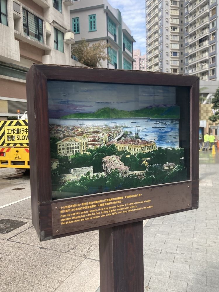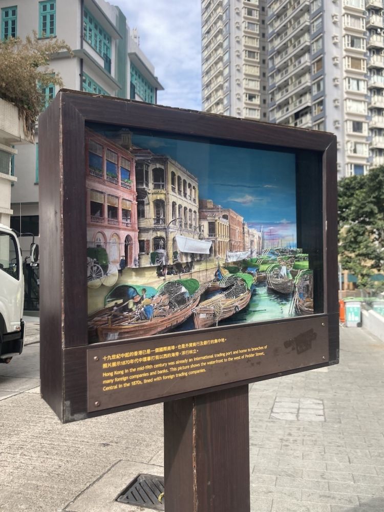 Just a few steps further, Bridges Street turns into Staunton Street, where you will encounter the next landmark. On the left side, standing in front of the north façade of PMQ, two small but noticeable signs display photos of Hong Kong in the nineteenth century. One is a coloured drawing of the harbour in Central in the 1870s, the other of Pedder Street in Central before land reclamation. These works by Alexis Ip strikingly display the trading vessels that characterised Hong Kong’s influential commercial role at the time.