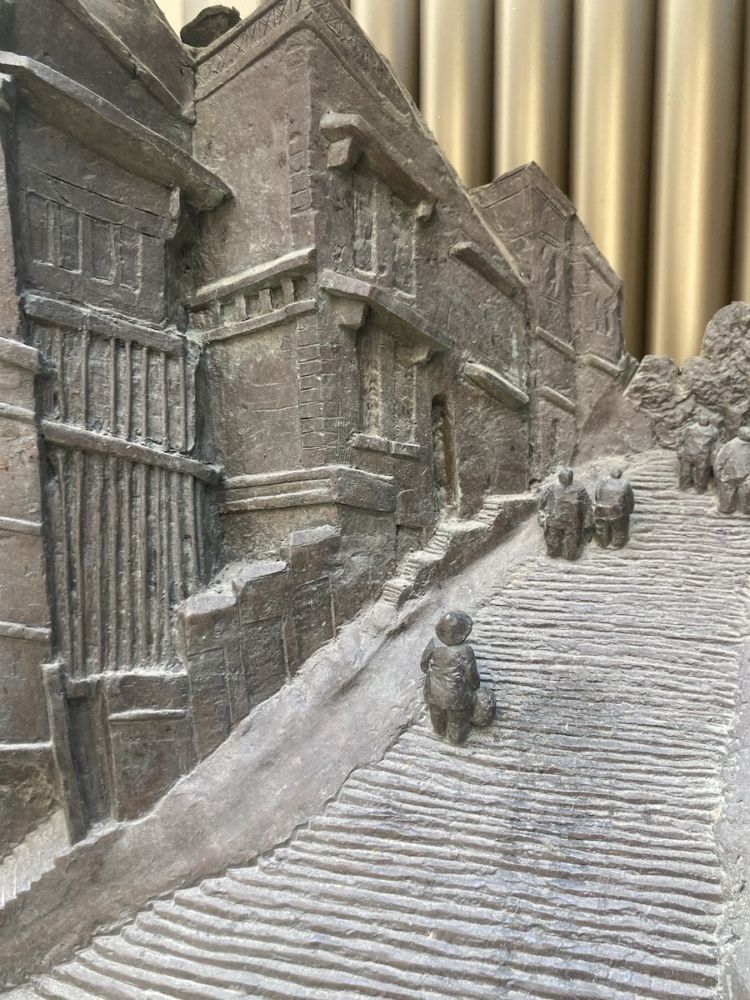 Once you’ve taken in the various installations in Pak Tsz Park, go back up the same flight of stairs and take a right. On the side of the road, on the corner with Aberdeen Street, you’ll notice a second distorted iron building recreation by Tang Kwok-hin, similar to the one located on Eastern Street. This iteration marks the previous location of the College of Medicine. After attending the Diocesan Home and Orphanage and the Government Central School, Sun attended the College of Medicine. At the time, the college would have been situated by the Alice Memorial Hospital. As it is very close to the street railing, you’ll get a better view of the installation from across the street.