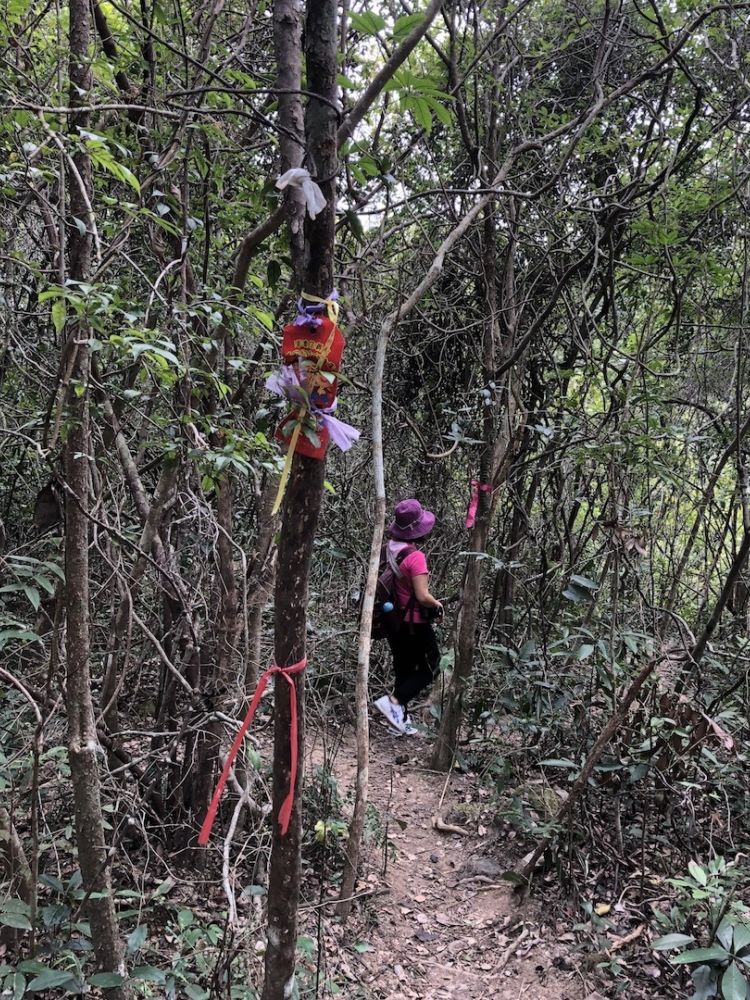 Walk straight past the village until you reach another junction in the road. Head to the left, where the road quickly becomes a forest path—not the stairs to the right. You will walk through the forest for around 10 to 15 minutes until a path opens up on your right towards the coastline. Helpful hikers have tied a bunch of red and purple ribbons here, and an old red lai see (利是) packet to mark the entrance. Head down this path until the road flattens out and runs along the coastline. You should get a glimpse of the embankment from here! Head to your right and keep going for another few minutes before you arrive at Pok Kwu Wan!