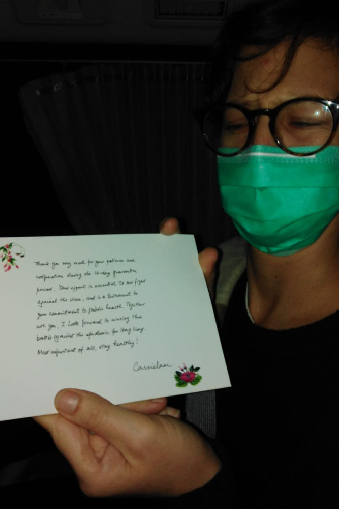 “When our spit tests came back negative, we were allowed to go home. We left with a ‘goodie bag’ full of the most random assorted goods you could think of, and the most hilarious of all, a thank-you postcard from Carrie Lam!”