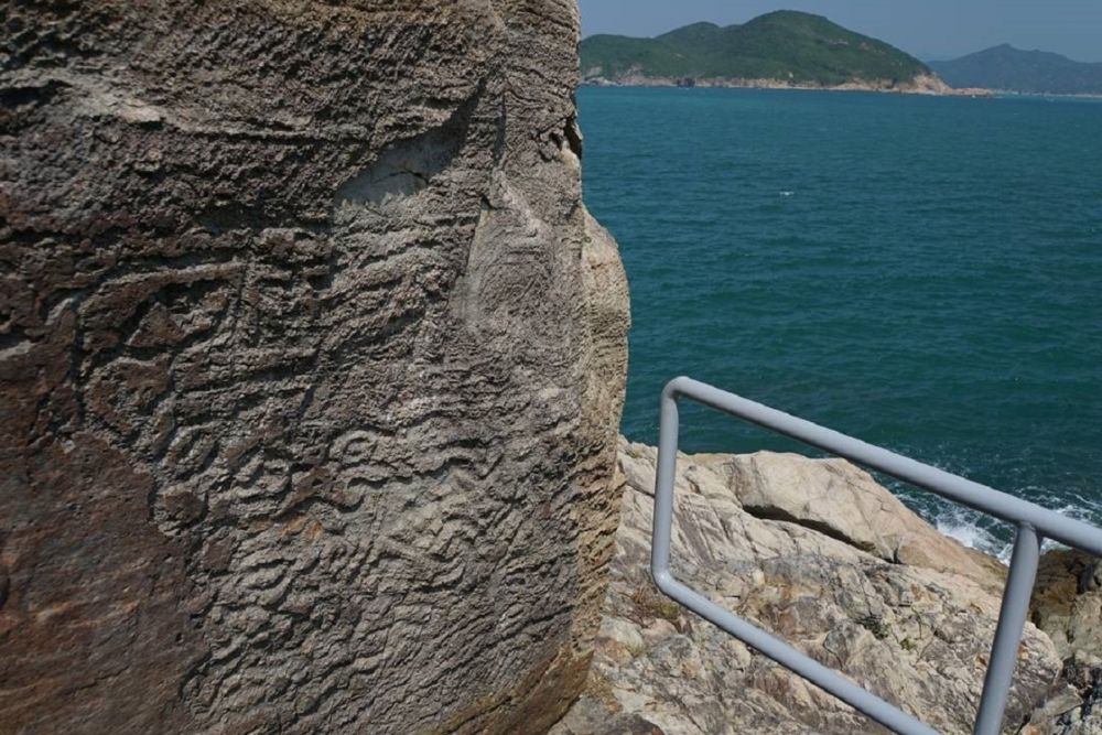 Located on the scenic island of Po Toi, the southernmost point of Hong Kong, is a set of carvings on a rock by the sea. The existence of the carvings had long been reported by local fisherfolk who saw them from the waters, but they were only officially discovered by authorities in the 1960s and recognised as monuments in 1979. The carvings, which are split by a 70-centimetre-wide fracture, feature what appear to be stylised animals and fish on the left, and a pattern of interlocking spirals on the right.