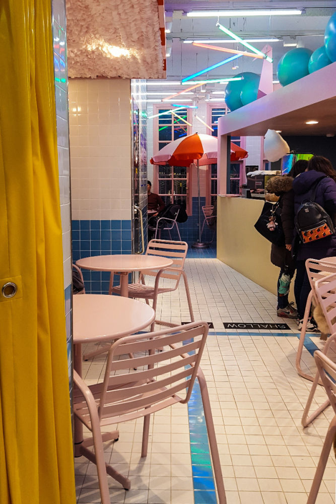True to its name, the diner-like Pink Pool Café is decked out in swimming pool tiles, metal tables and chairs with beach umbrellas, neon lights, and wall signages. On warm days, its signature cotton candy offerings are better enjoyed at the rooftop lounge lined with oversized pillows. If you’re looking for a real swimming pool, though, you may want to visit the bigger branch in Hongdae instead, which boasts an indoor poolside area.