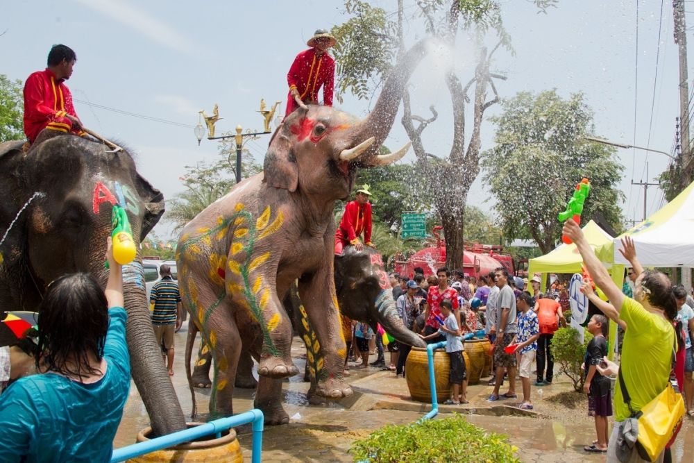 Ayutthaya features elephants in street celebrations. The colourfully painted behemoths are roped in to spray revellers with water from huge barrels, with their trunks likened to large hosepipes.