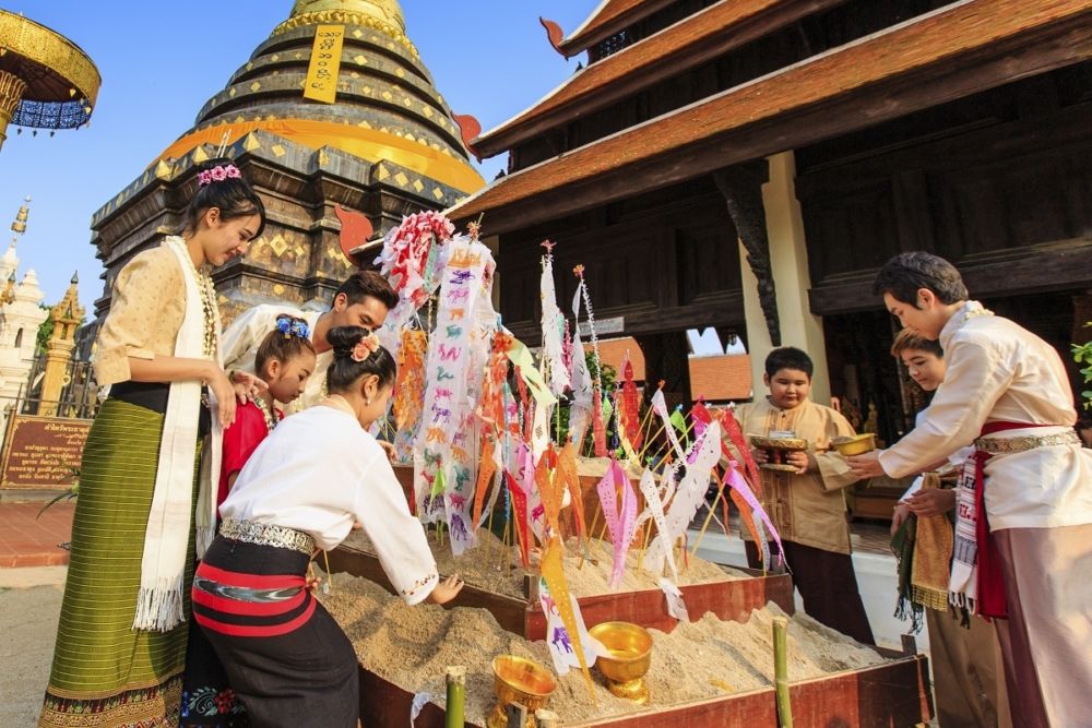 Devout Buddhists would take small bags of sand to the temple to signify a return of the dust they had carried away on their feet while visiting the temple in the past year. The sand is shaped into small stupas topped off with flags in honour of the Buddha. Some temples even hold contests where devotees sculpt large, elaborate sand sculptures. Some Thais also apply a white pasty powder on each other’s face or neck to ward off bad luck.