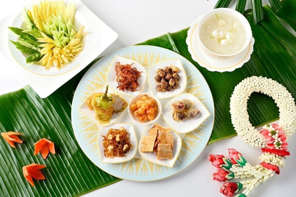 Songkran is also a time to enjoy a special seasonal dish. Aimed at cooling down the body, khao chae (ข้าวแช่; “rice soaked in cool water”) is only available from mid-March until the end of April. This Songkran speciality consists of ice-chilled rice in jasmine-scented water served with side dishes. These dishes include sweet pepper, deep-fried battered egg, stuffed shallots, deep-fried shrimp paste, sweet fish, salty beef, and pickled vegetables and fruit. Take a small bite of a side dish and follow up with a spoonful of icy rice. Preparing khao chae is a painstaking effort as it is time-consuming, involving a long list of ingredients for the different dishes.